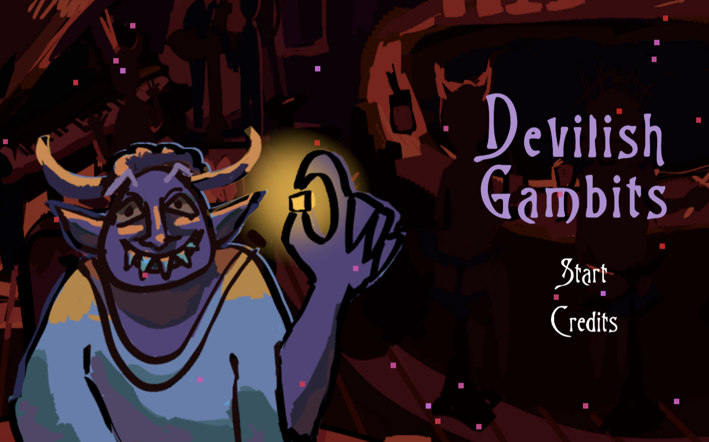 Fret not, however, as you are just a friendly and amicable devil relaxing at an infernal jazz lounge after a very long day of soul harvesting. To pass time, you and your devil coworker decide to play Devilish Gambits (Hell's oldest game), gambling away all the souls you tirelessly spent collecting this quarter. Although at first, it only seemed like a silly match, as the game progresses, your coworker's calm demeanour starts to fade ... it's no longer just a frivolous pastime.
